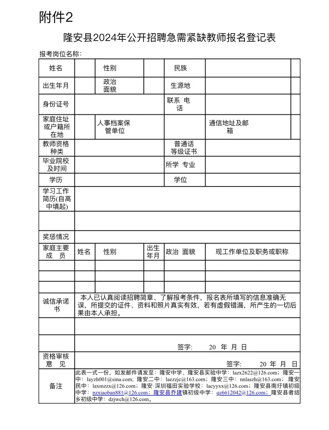 (1)“隆安縣2024年公開(kāi)招聘急需緊缺教師報(bào)名登記表”電子版??傻卿洀V西南寧市人力資源和社會(huì)保障局網(wǎng)站、廣西南寧市隆安縣人民政府門(mén)戶(hù)網(wǎng)站、隆安縣民族中學(xué)微信公眾號(hào)下載。