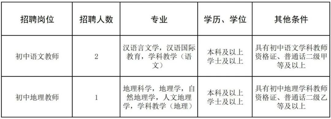 根據發(fā)展需要,學校擬招聘初中語文、初中地理頂崗教師共3人,具體招聘信息如下: