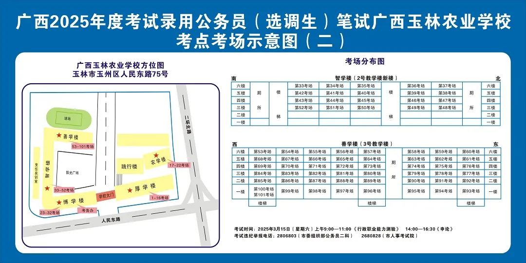 請(qǐng)及時(shí)登錄“廣西人事考試網(wǎng)”打印筆試準(zhǔn)考證并妥善保管,仔細(xì)查看準(zhǔn)考證上的考點(diǎn)信息。本次考試玉林市考區(qū)共設(shè)11個(gè)考點(diǎn),各考點(diǎn)名稱及地址如下: