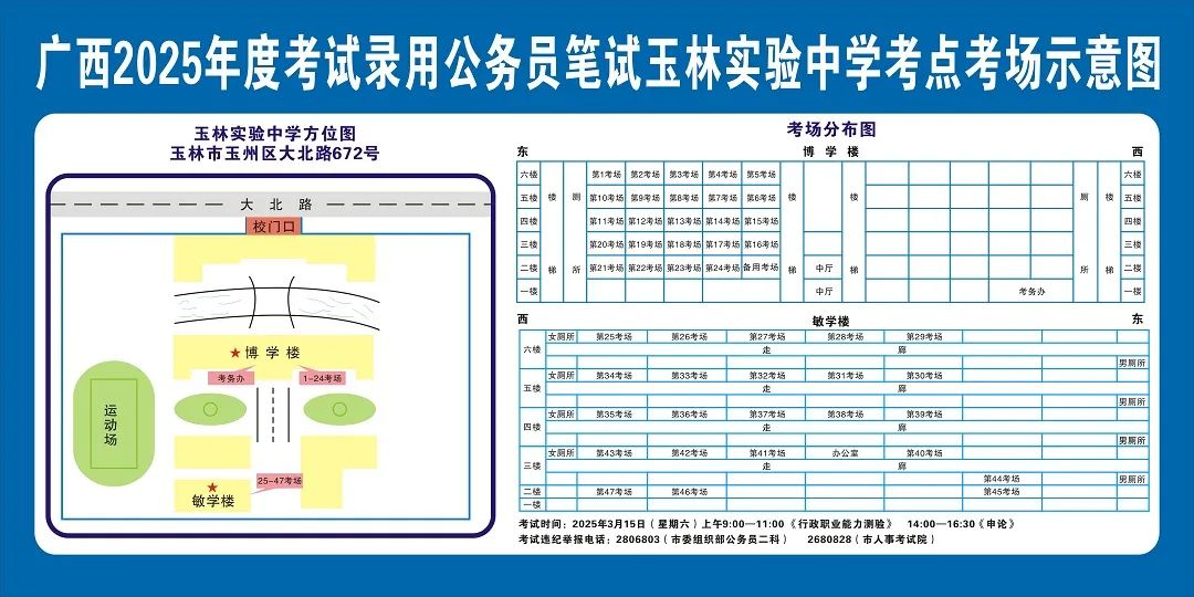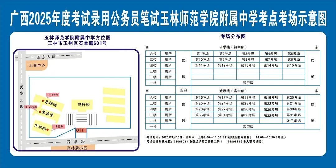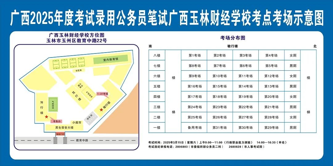 除考試當(dāng)天考生可以進(jìn)入考點(diǎn)外,考生不得提前進(jìn)入考點(diǎn)查看考場(chǎng)(學(xué)校將在大門(mén)處擺放考場(chǎng)分布示意圖),玉林考區(qū)11個(gè)考點(diǎn)的考場(chǎng)布置情況如下: