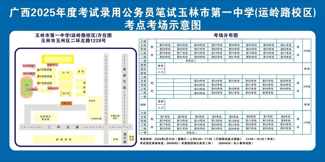 玉林市第一中學(xué)(運(yùn)嶺路校區(qū))考點(diǎn)11:00-12:00,16:30-17:30 在考點(diǎn)安排公交車(chē)和值勤人員,負(fù)責(zé)將考生接送到玉林汽車(chē)總站。