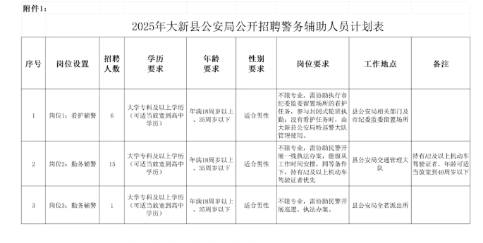 為適應(yīng)當(dāng)前社會(huì)治安形勢(shì)的需要,進(jìn)一步充實(shí)公安機(jī)關(guān)警務(wù)輔助力量,推進(jìn)平安大新建設(shè),有效維護(hù)社會(huì)治安穩(wěn)定,根據(jù)《廣西壯族自治區(qū)公安機(jī)關(guān)警務(wù)輔助人員條例》《崇左市公安機(jī)關(guān)警務(wù)輔助人員管理辦法》《崇左市公安機(jī)關(guān)警務(wù)輔助人員管理招聘管理辦法》(試行)等文件精神,經(jīng)縣人民政府同意,大新縣公安局決定面向社會(huì)公開(kāi)招聘警務(wù)輔助人員22名(以下簡(jiǎn)稱(chēng)輔警)。現(xiàn)將有關(guān)事項(xiàng)公告如下: