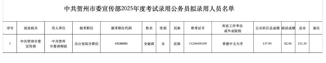 中共賀州市委宣傳部2025年度考試錄用公務(wù)員擬錄用人員公示