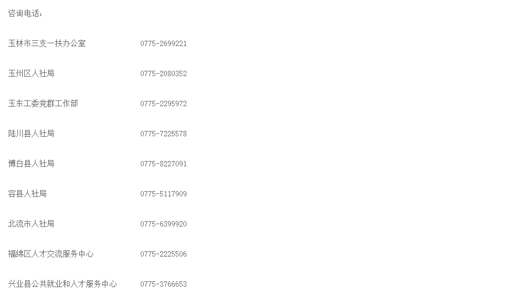 具體事宜可進入廣西高校畢業(yè)生“三支一扶”服務(wù)網(wǎng)(http://szyf.gxrc.com)查詢政策或向玉林市“三支一扶”辦公室電話咨詢。