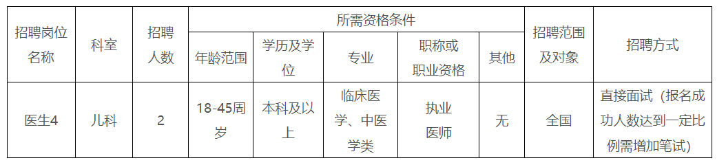 根據(jù)醫(yī)院發(fā)展需要,我院決定面向社會(huì)招聘兒科醫(yī)師2名,現(xiàn)將有關(guān)事項(xiàng)公告如下: