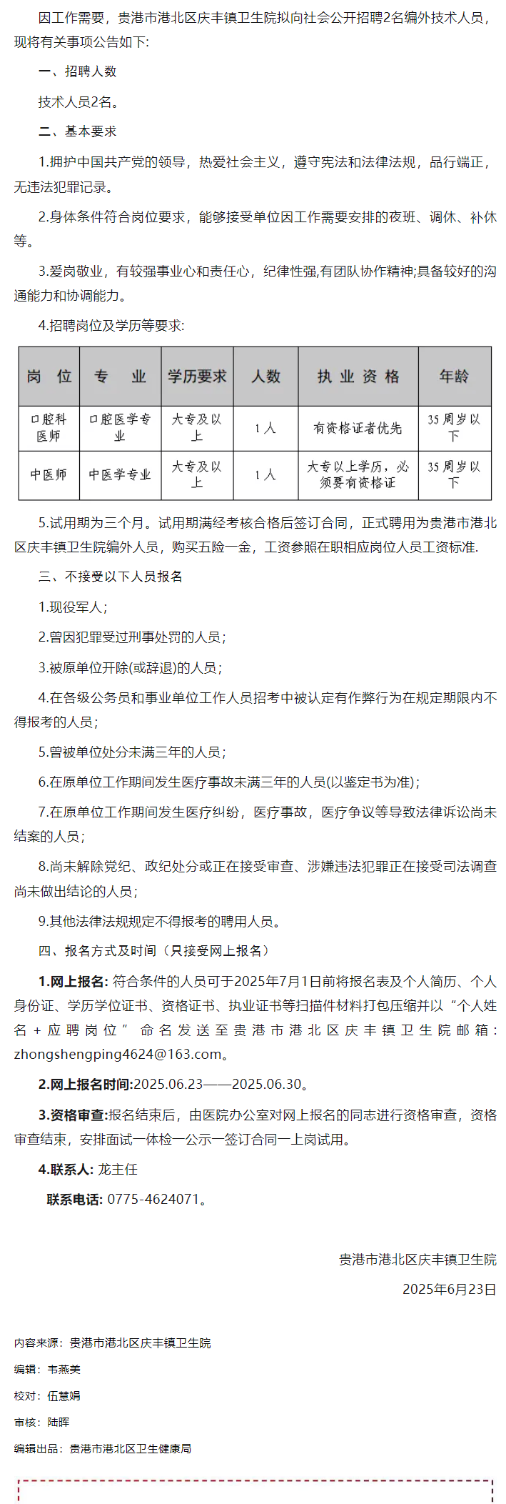 2025年貴港市港北區(qū)慶豐鎮(zhèn)衛(wèi)生院招聘編外技術(shù)人員2人