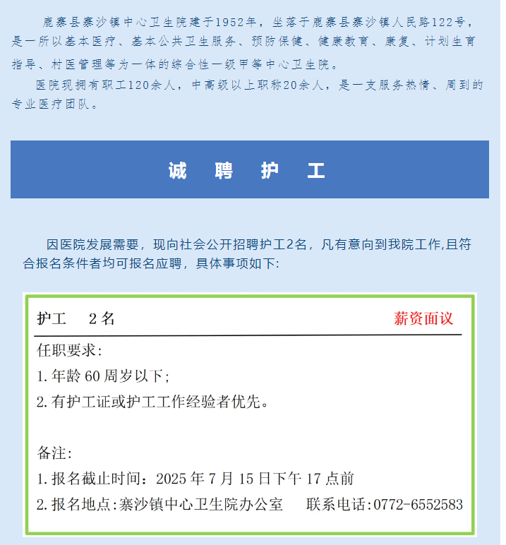 2025年鹿寨縣寨沙鎮(zhèn)中心衛(wèi)生院公開招聘護工公告