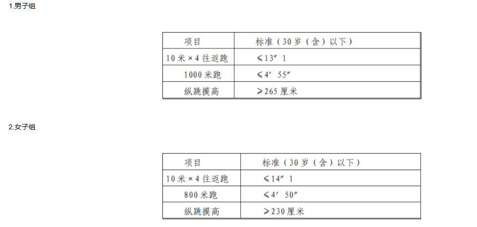 體能測評的標(biāo)準(zhǔn),參照《關(guān)于印發(fā)公安機關(guān)錄用人民警察體能測評項目和標(biāo)準(zhǔn)(暫行)的通知》(人社部發(fā)〔2011〕48號)的標(biāo)準(zhǔn),具體如下: