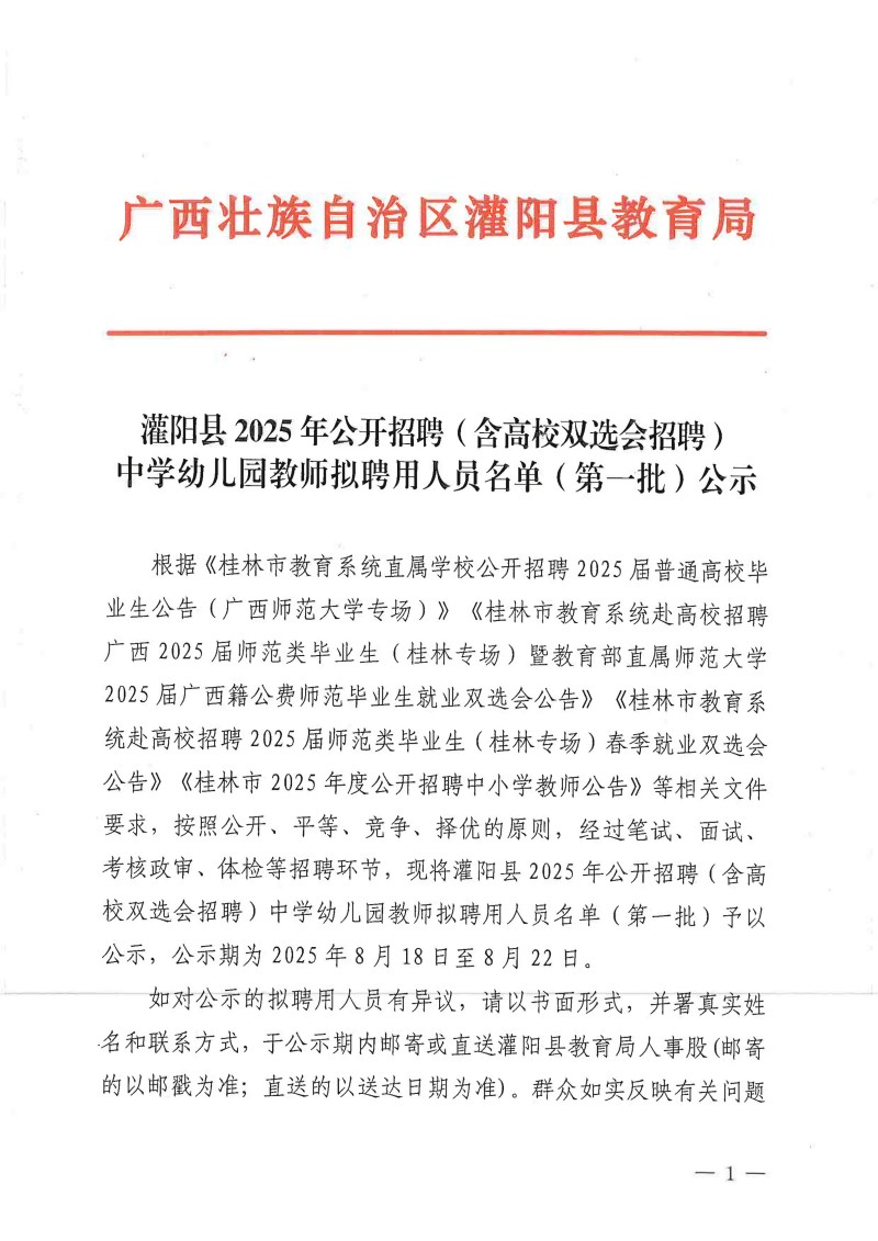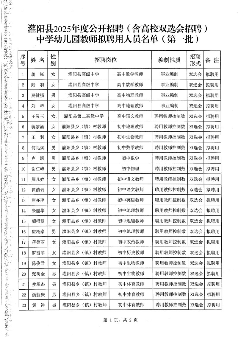 灌陽縣2025年公開招聘(含高校雙選會招聘)中學幼兒園教師擬聘用人員名單(第一批)公示