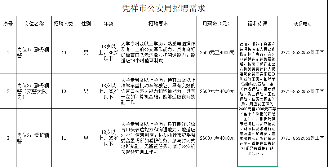 為適應(yīng)憑祥市公安機(jī)關(guān)管理工作發(fā)展需要,憑祥市公安局決定面向社會(huì)公開(kāi)招聘61名警務(wù)輔助人員(以下簡(jiǎn)稱輔警)。具體事宜如下: