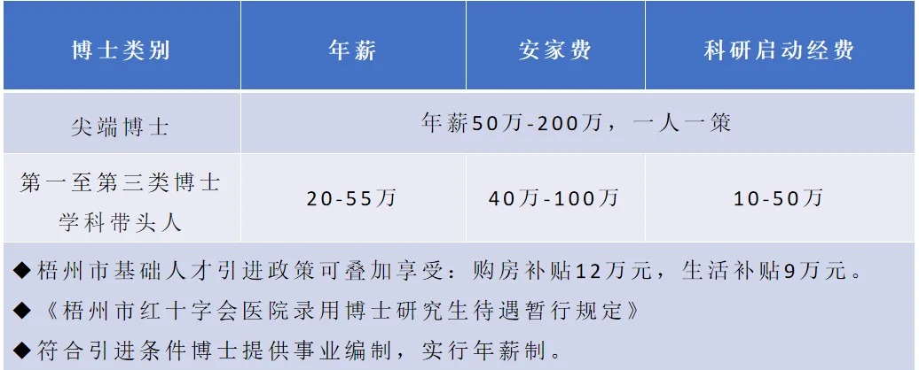 博士研究生學(xué)歷學(xué)位的急需緊缺專業(yè)人才:享受醫(yī)院引進(jìn)博士待遇20-200萬元/年,實行年薪制待遇一人一議,提供科研啟動經(jīng)費10萬-50萬元,疊加享受梧州市人才引進(jìn)補助,安家費52-125萬元,生活補貼9-12萬元。