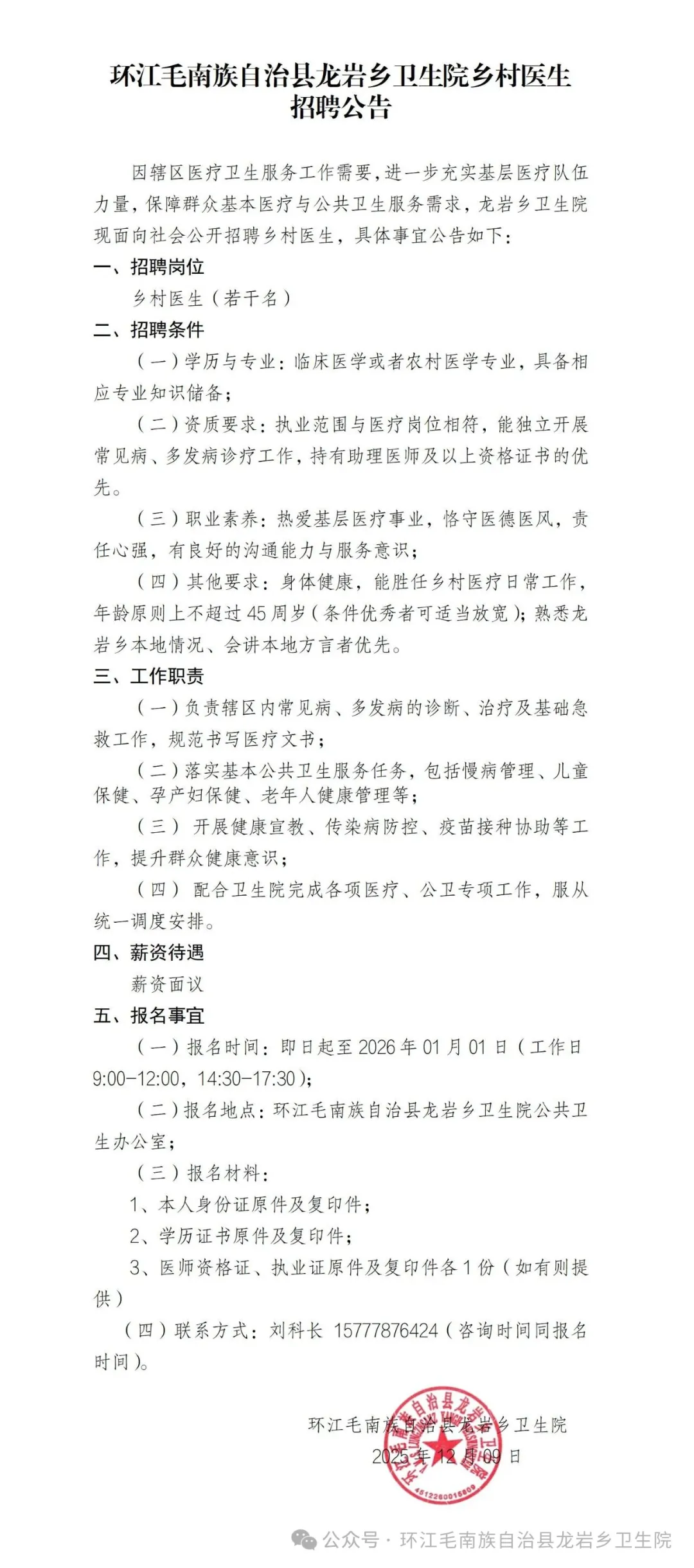 2025河池環(huán)江毛南族自治縣龍巖鄉(xiāng)衛(wèi)生院鄉(xiāng)村醫(yī)生招聘若干人