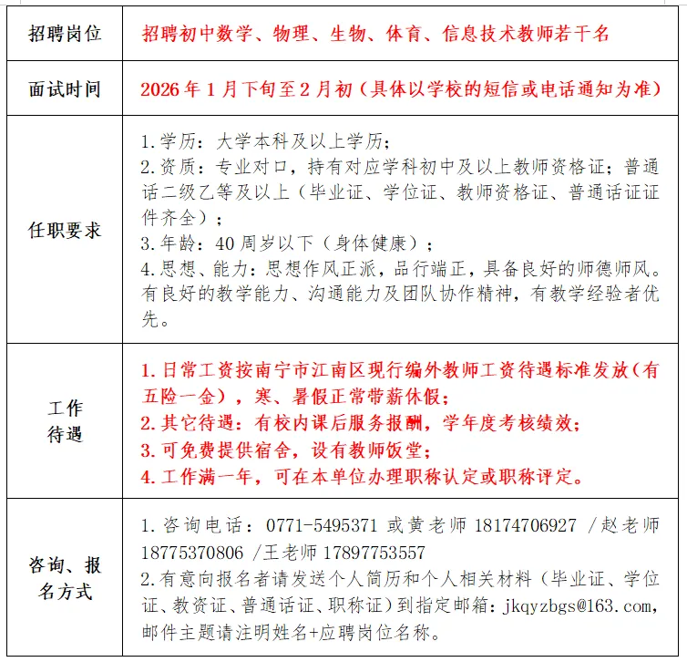 原文標(biāo)題:南寧經(jīng)濟技術(shù)開發(fā)區(qū)第一初級中學(xué)2026年春季學(xué)期教師招聘公告