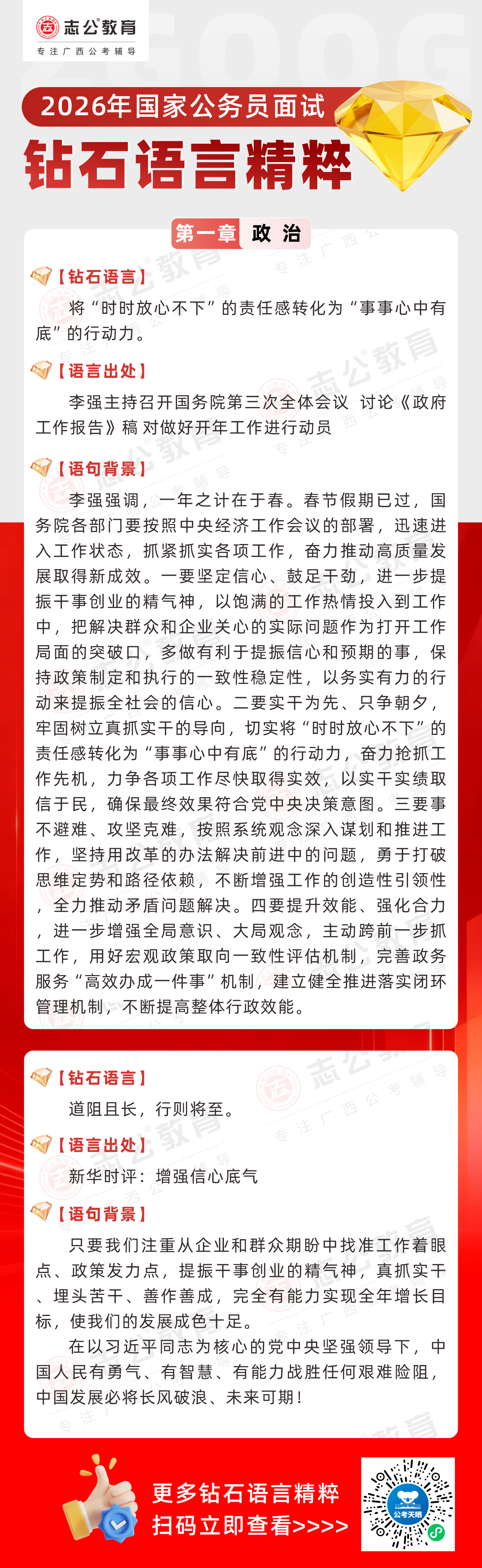 志公教育推出《2026國(guó)家公務(wù)員面試·鉆石語言精粹》政治篇!幫助考生把握政治類題目應(yīng)答邏輯,提升語言表達(dá)層次,助你在面試中脫穎而出。備考2026國(guó)考面試,從掌握“鉆石語言”開始!