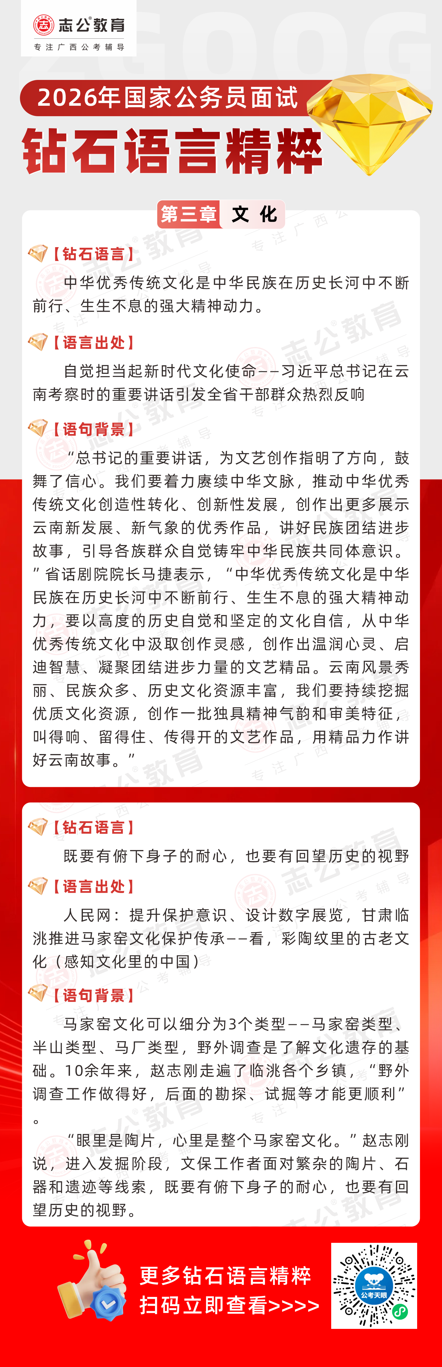 志公教育推出《2026國家公務員面試·鉆石語言精粹》!幫助考生把握文化類題目應答邏輯,提升語言表達層次,助你在面試中脫穎而出。備考2026國考面試,從掌握“鉆石語言”開始!