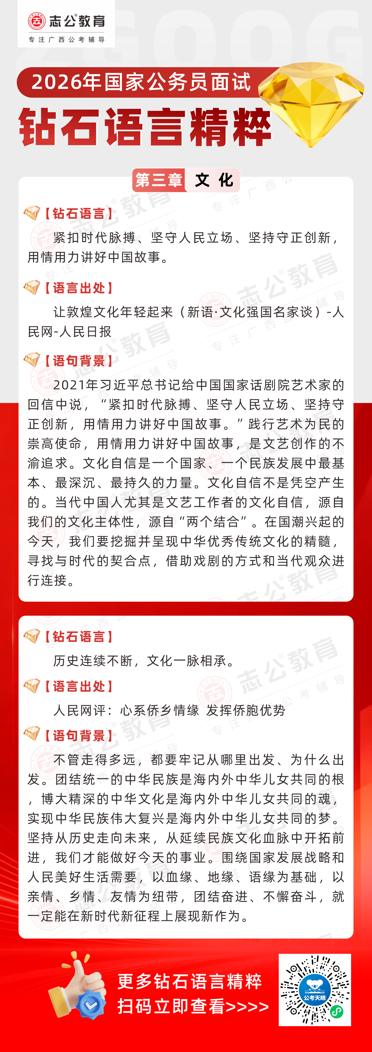 志公教育推出《2026國家公務(wù)員面試·鉆石語言精粹》文化篇!幫助考生把握文化類題目應(yīng)答邏輯,提升語言表達(dá)層次,助你在面試中脫穎而出。備考2026國考面試,從掌握“鉆石語言”開始!