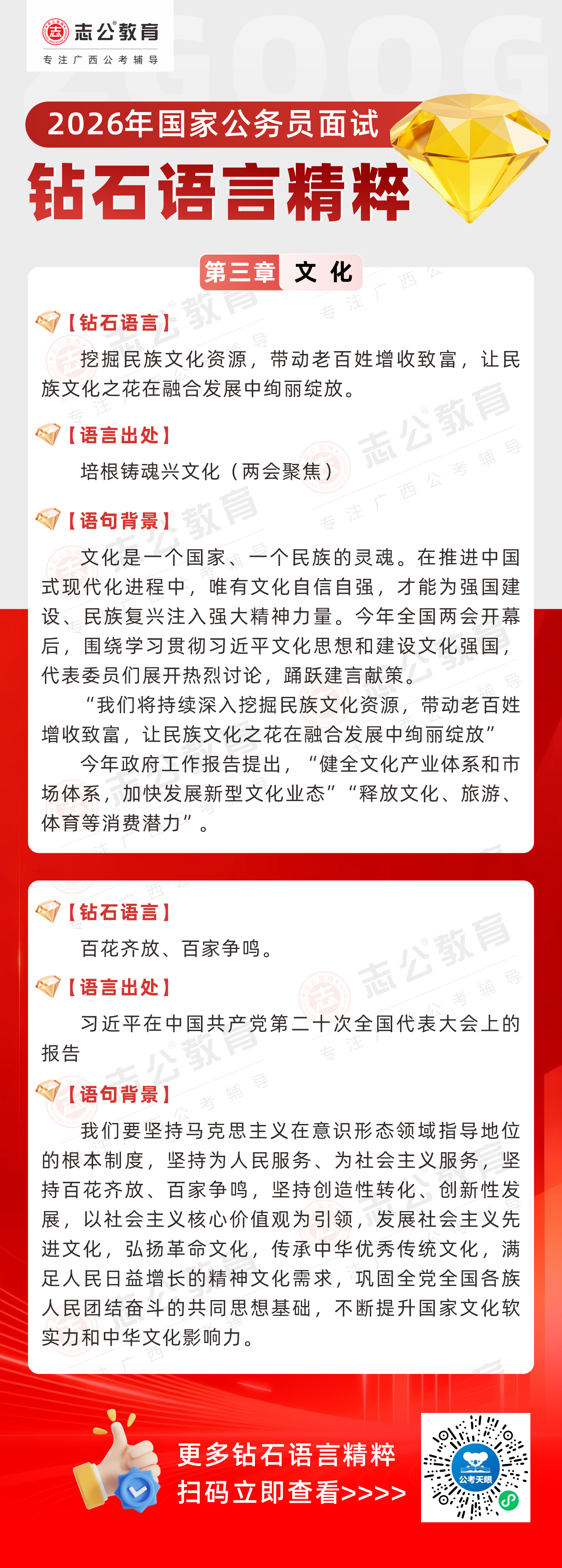 志公教育推出《2026國家公務員面試·鉆石語言精粹》文化篇!幫助考生把握文化類題目應答邏輯,提升語言表達層次,助你在面試中脫穎而出。備考2026國考面試,從掌握“鉆石語言”開始!