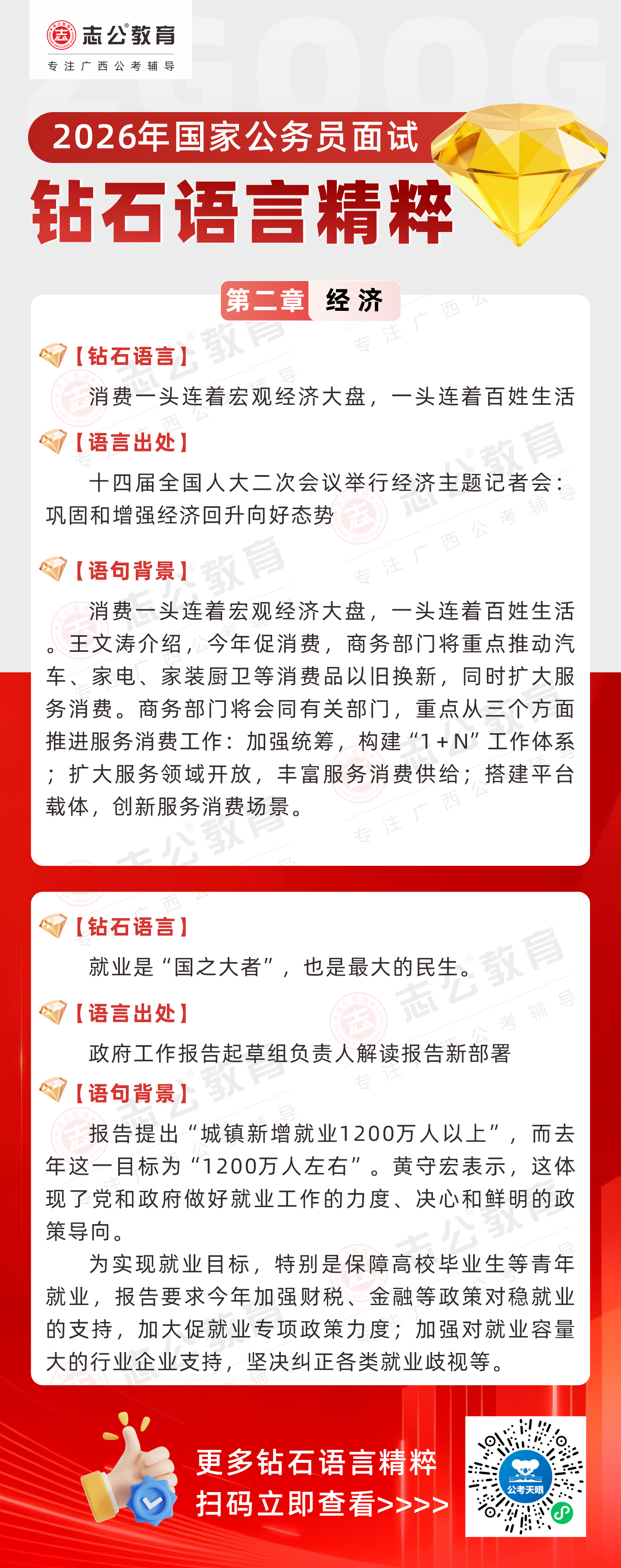志公教育推出《2026國家公務員面試·鉆石語言精粹》經(jīng)濟篇!幫助考生把握經(jīng)濟類題目應答邏輯,提升語言表達層次,助你在面試中脫穎而出。備考2026國考面試,從掌握“鉆石語言”開始!