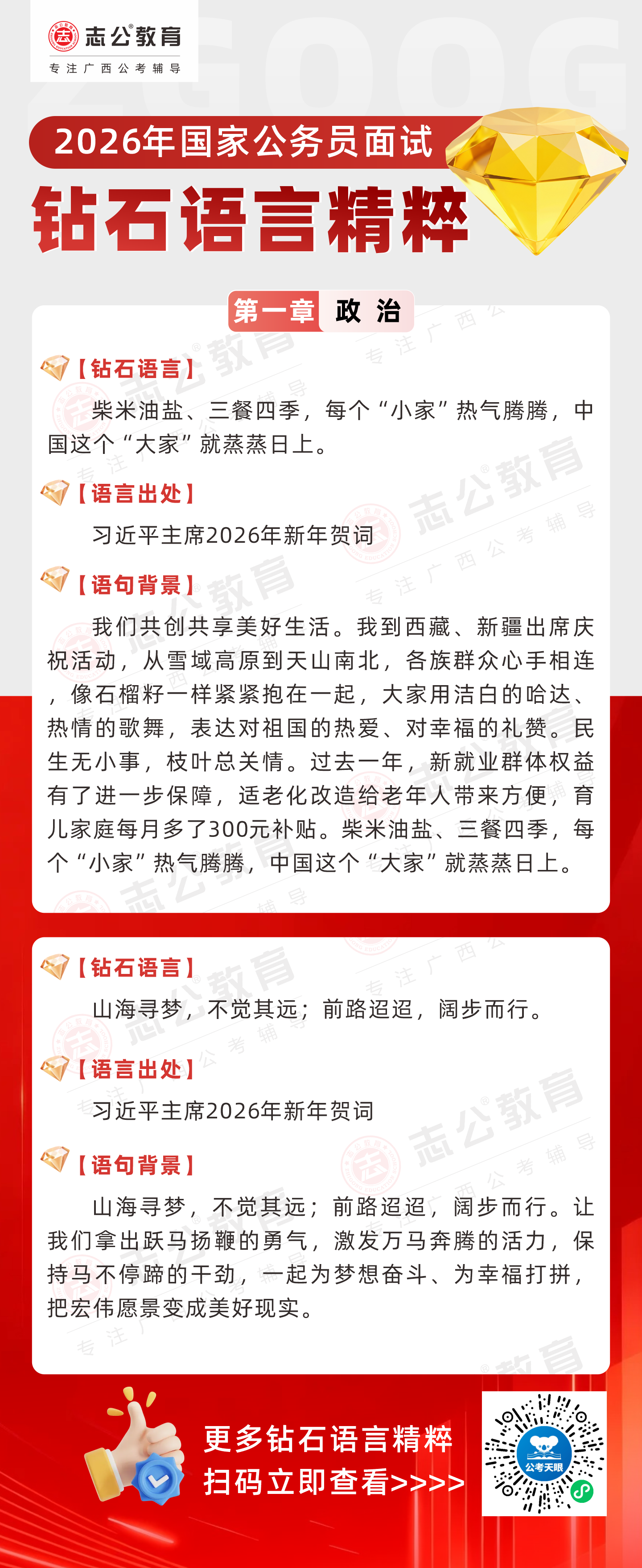 志公教育推出《2026國家公務(wù)員面試·鉆石語言精粹》政治篇!幫助考生把握政治類題目應(yīng)答邏輯,提升語言表達層次,助你在面試中脫穎而出。備考2026國考面試,從掌握“鉆石語言”開始!
