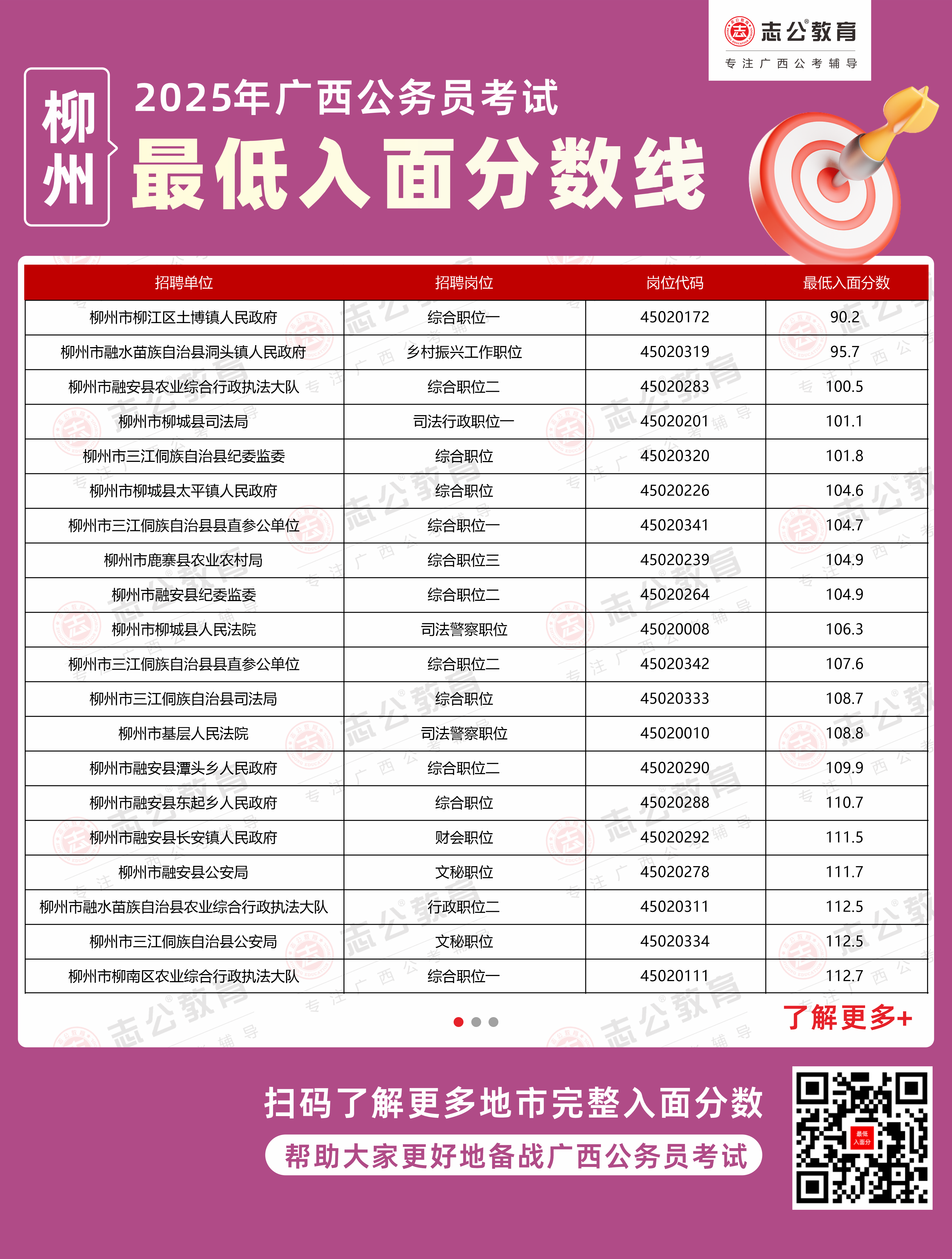 以下為志公教育根據(jù)官方公布的面試資格審查名單整理的柳州市部分單位的進面最低筆試分數(shù)(含照顧加分),數(shù)據(jù)僅供參考,具體以官方實際公布為準。