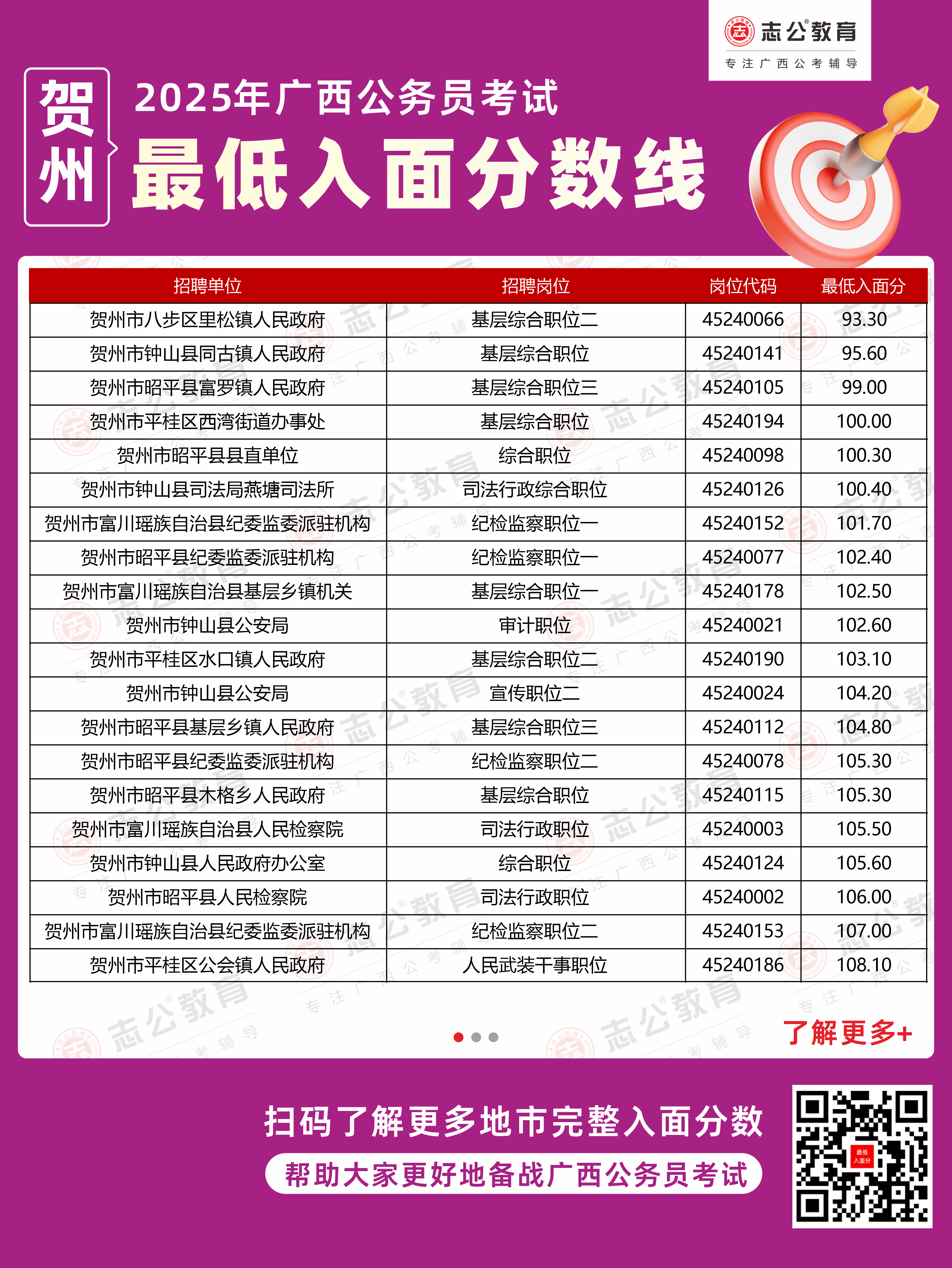 以下為志公教育根據(jù)官方發(fā)布的面試資格審查公告及公開數(shù)據(jù)整理的賀州市部分單位的進面最低筆試分數(shù)(含照顧加分),數(shù)據(jù)僅供參考,具體以官方實際公布為準。