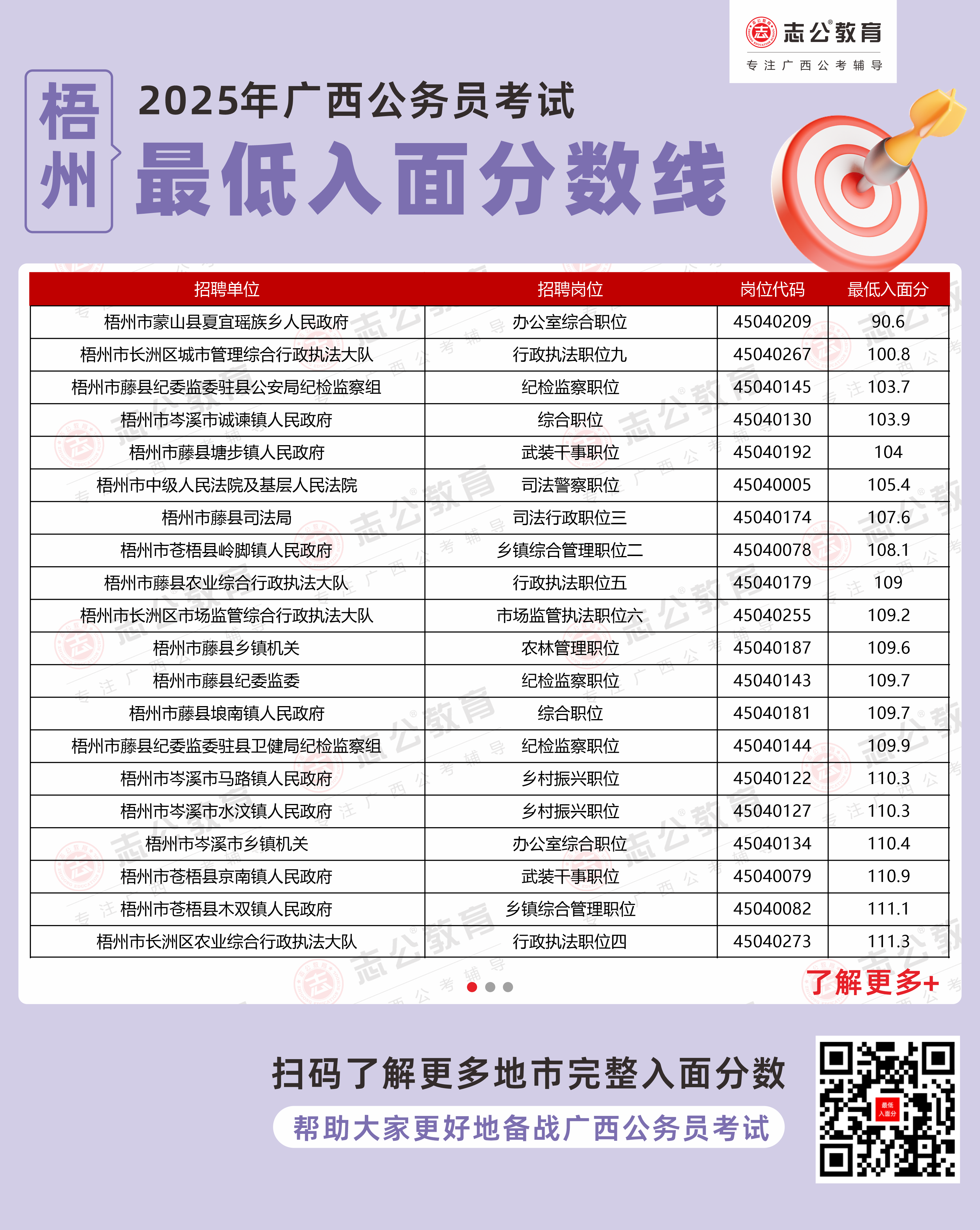 以下為志公教育根據官方發(fā)布的面試資格審查公告及公開數據整理的梧州市部分單位的進面最低筆試分數(含照顧加分),數據僅供參考,具體以官方實際公布為準。