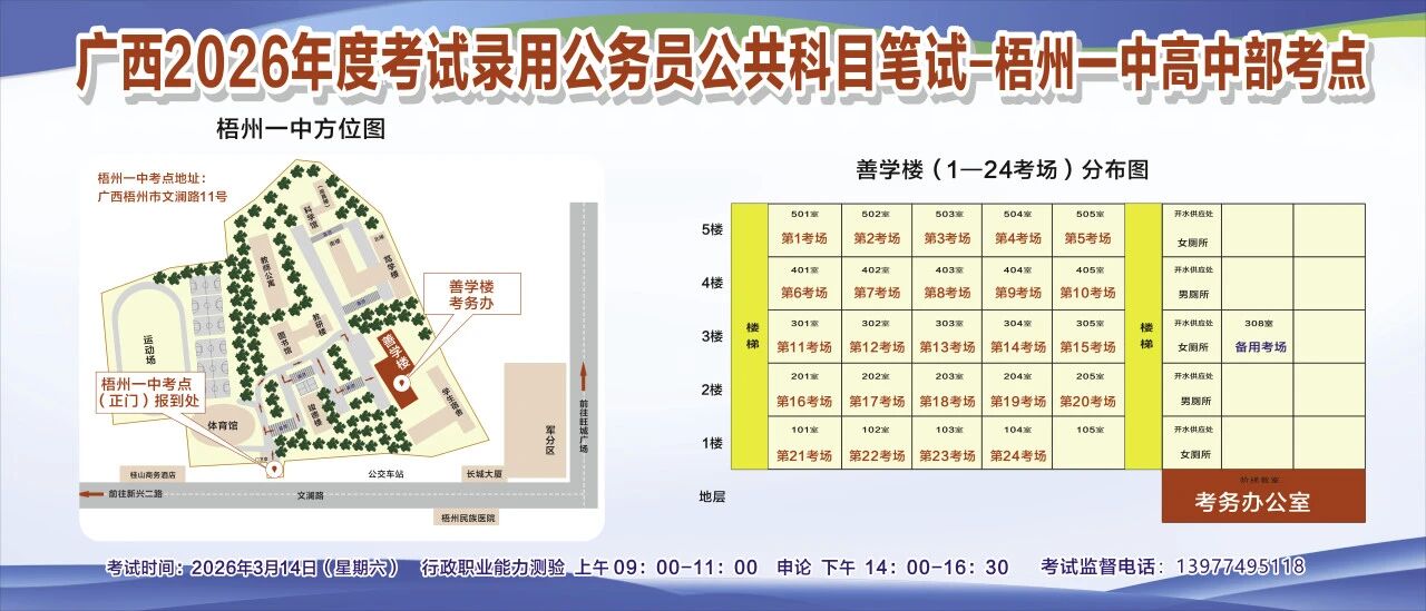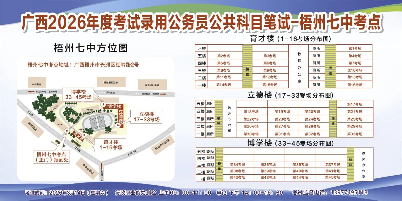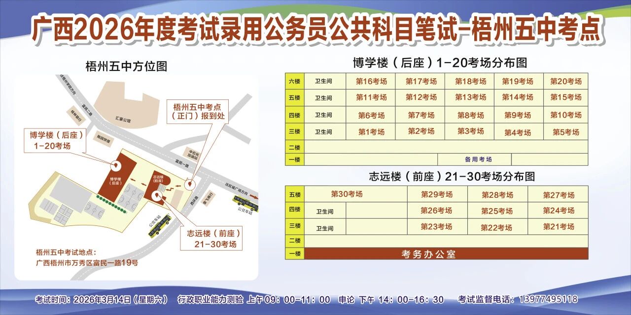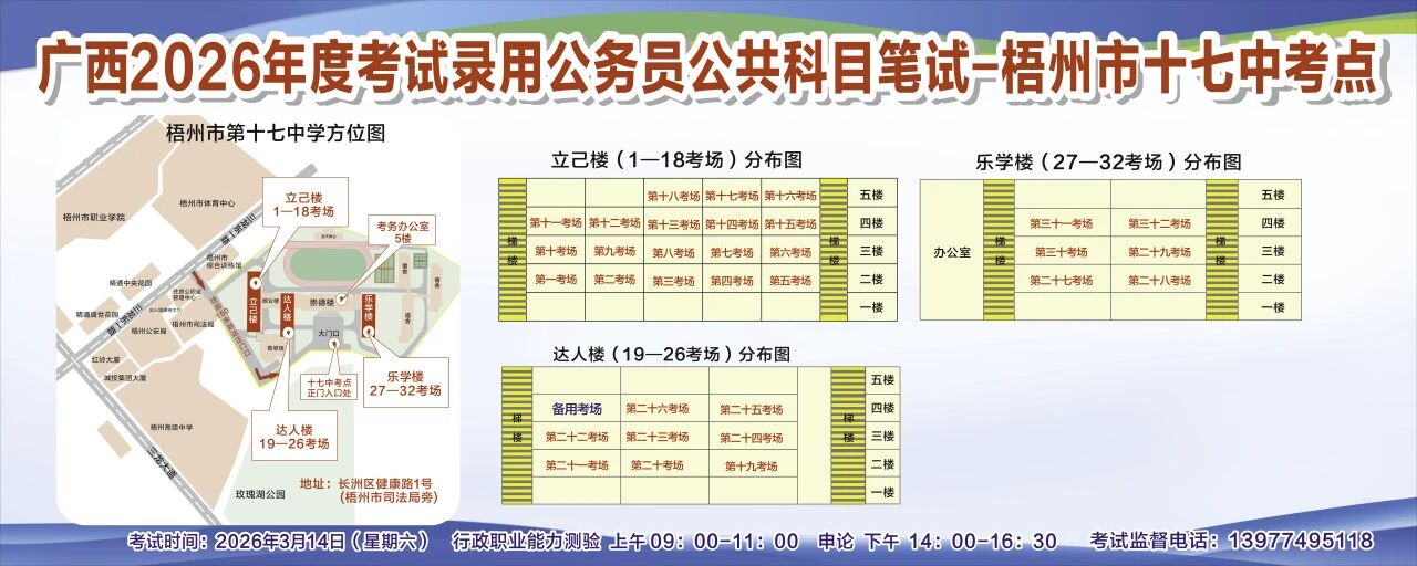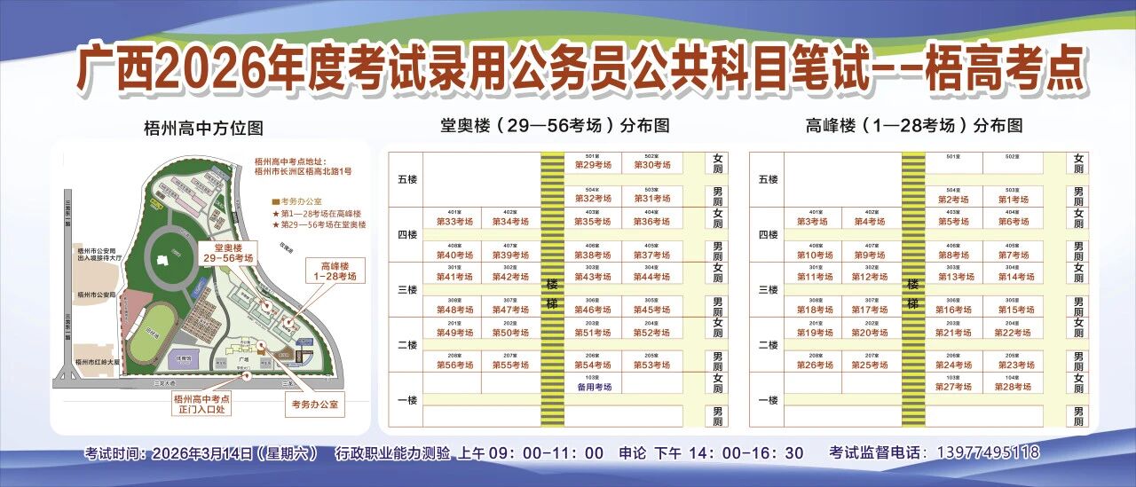 一、廣西2026年度考試錄用公務(wù)員(選調(diào)生)公共科目筆試將于3月14日舉行,梧州考區(qū)共設(shè)置10個考點,請考生提前熟悉各自考點位置、周邊環(huán)境及交通情況,考試當天提前出門做好準備,準時參加考試。