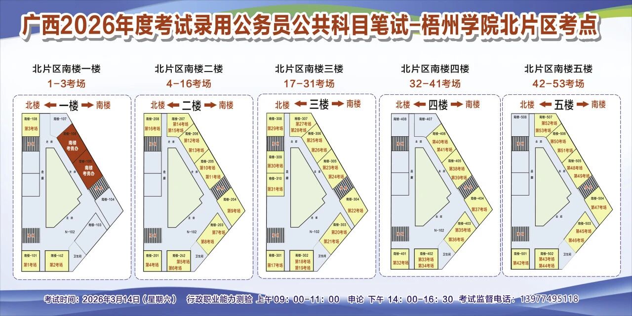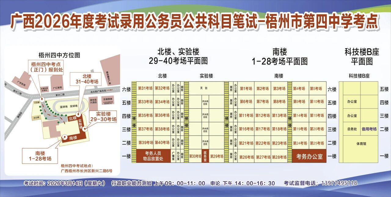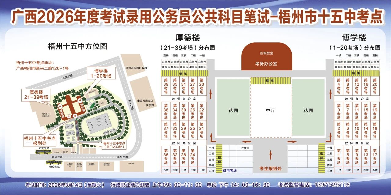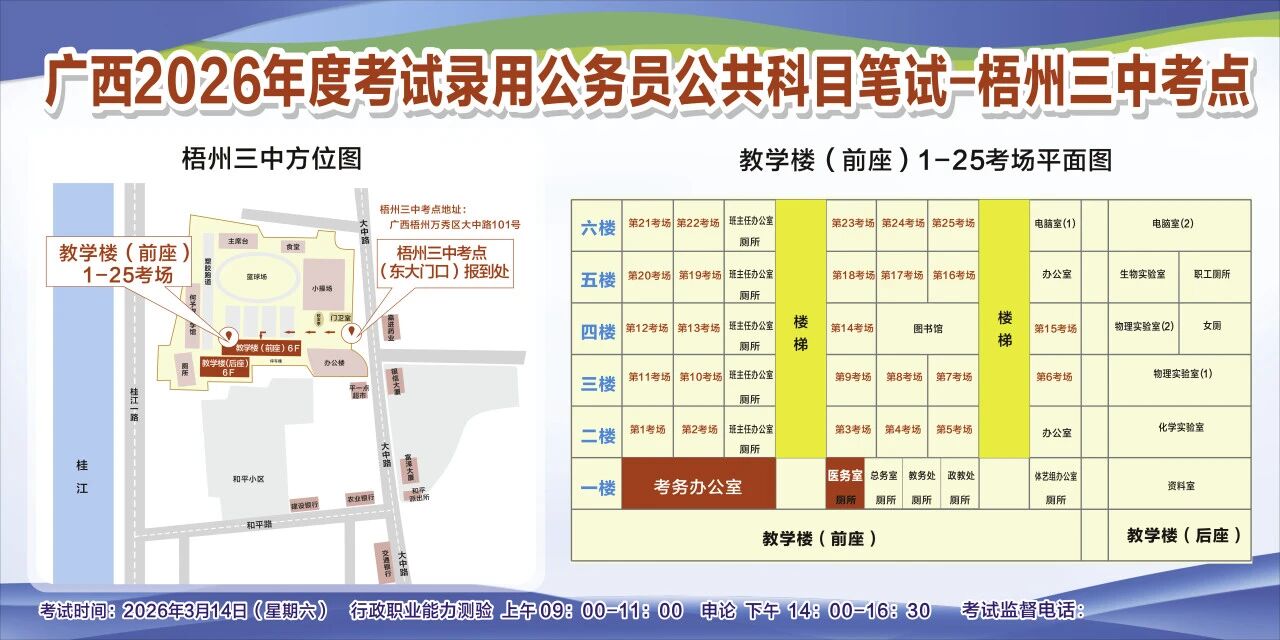 一、廣西2026年度考試錄用公務(wù)員(選調(diào)生)公共科目筆試將于3月14日舉行,梧州考區(qū)共設(shè)置10個考點,請考生提前熟悉各自考點位置、周邊環(huán)境及交通情況,考試當天提前出門做好準備,準時參加考試。