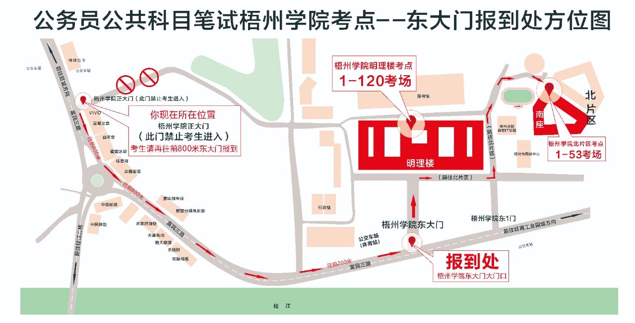 (九)梧州學(xué)院明理教學(xué)樓、梧州學(xué)院北片區(qū)(萬秀區(qū)富民三路82號)特別提醒:明理教學(xué)樓和北片區(qū)屬不同考點,請考生看清楚準考證,切勿走錯考場。