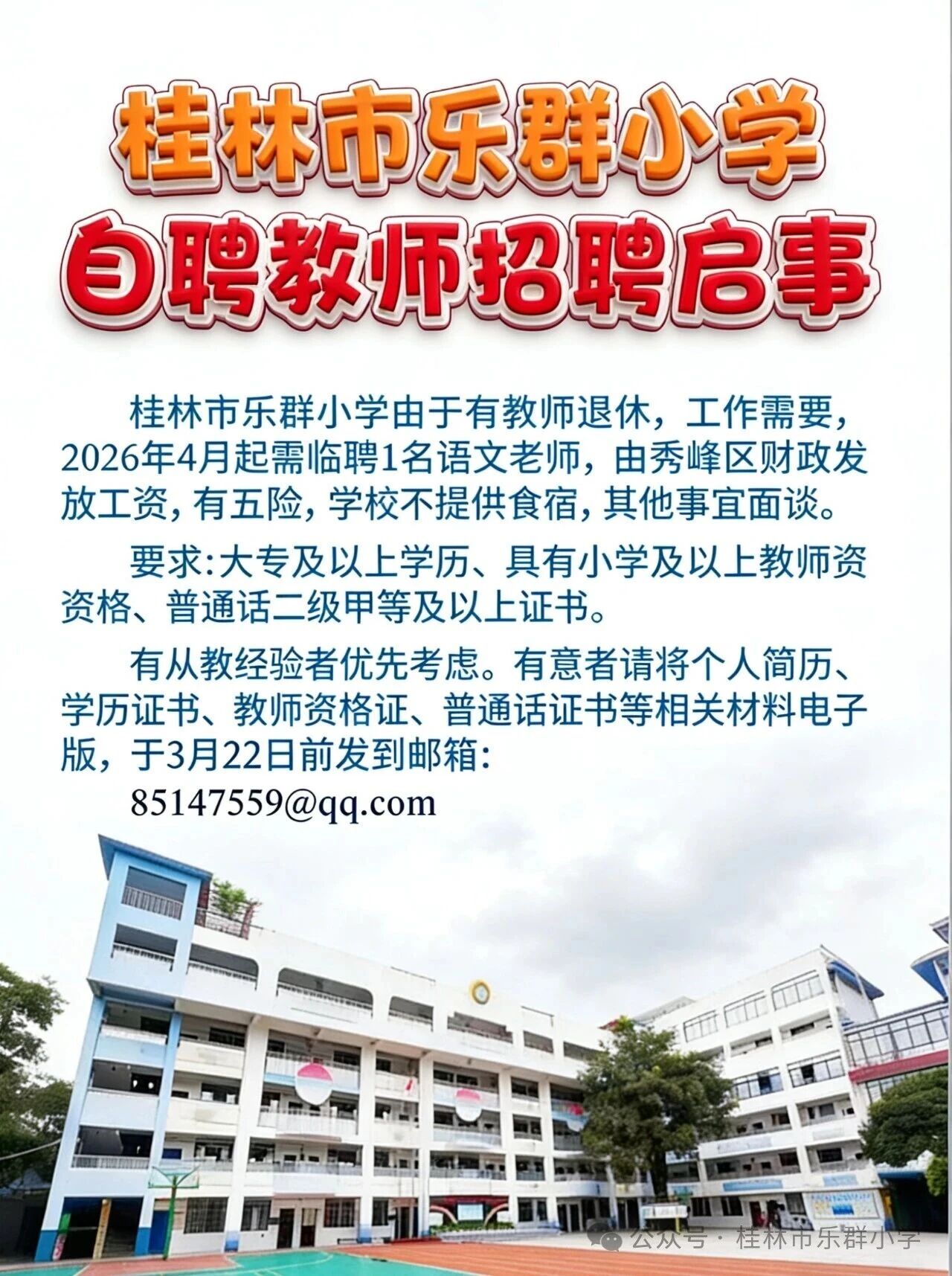 原文標(biāo)題:桂林市樂群小學(xué)自聘教師招聘啟事