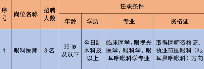 根據(jù)科室業(yè)務(wù)發(fā)展需要,面向社會公開招聘眼科醫(yī)師3名,具體崗位要求如下: