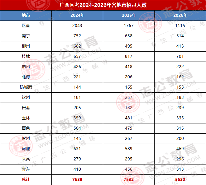 2026廣西區(qū)考招錄人數(shù)較去年大幅度減少,2026年招錄公告,本次區(qū)考計劃招錄總?cè)藬?shù)為5630人,較2025年的7532人減少1902人,同比降幅達25.25%,是近年招錄規(guī)模收縮幅度較大的一年。