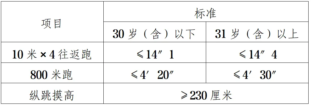 按照《關(guān)于印發(fā)〈公安機關(guān)錄用人民警察體能測評項目和標(biāo)準(zhǔn)〉的通知》(公政治〔2024〕60號)執(zhí)行。體能測評項目包括10米×4往返跑、1000米(男)/800米(女)跑、縱跳摸高等3個項目。其中,綜合管理類、執(zhí)法勤務(wù)類職位測查全部3個項目,警務(wù)技術(shù)類職位免予測查1000米(男)/800米(女)跑項目;對于專業(yè)人才緊缺難以形成競爭的特殊職位(緊缺職位),報考人員需在參加體能測評前,從3項體能測評項目中選擇2項參加測試。凡應(yīng)測項目中任意一項不達標(biāo)的,即為體能測評不合格。具體如下: